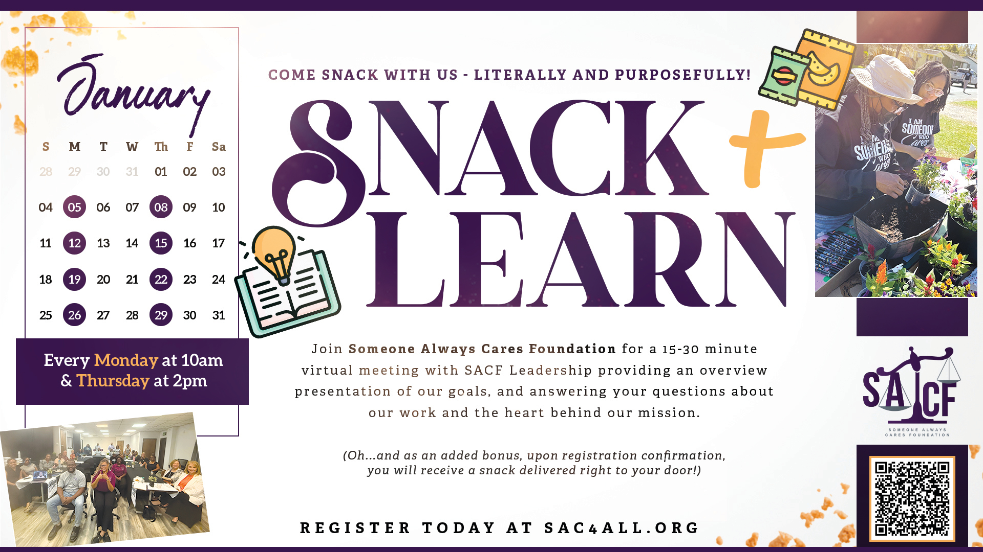 ✨ We’ll even deliver a snack to your door once your registration is confirmed—so you can SNACK with us, literally and purposefully!