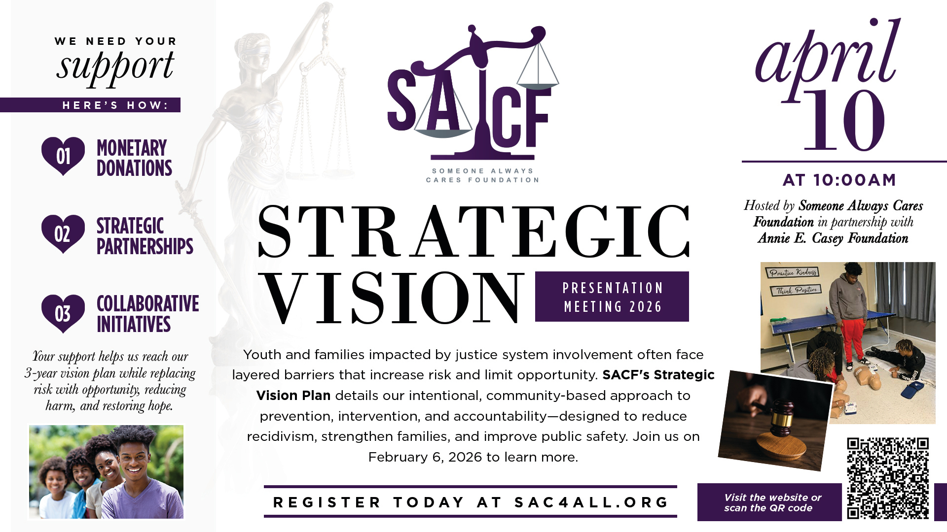 Someone Always Cares Foundation in partnership with the Annie E Casey Foundation invites you to a pivotal Strategic Vision Presentation where we will unveil our 3-Year Plan to Replace Risk with Opportunity and Reduce Harm, Restore Hope in our communities.